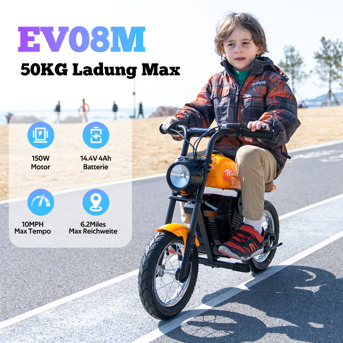 The EV08M delivers child-friendly performance with a carefully limited 16 km/h top speed and up to 10 km of riding range per charge, powered by a stable 150W motor system. Its lightweight 12.3kg frame (97×50×64cm) is perfectly proportioned for young riders while maintaining durable construction.